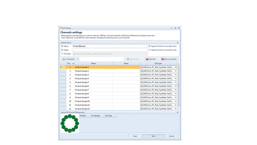 sowie das PSA-Modul für die Berechnung der Partikelgrössenverteilung. Das integrierte Animationswerkzeug gestattet die wiederholte schrittweise Anzeige der Messdaten zur leichten Identifikation auch komplexer Entmischungsphänomene mit einstellbaren Anzeigeparametern.